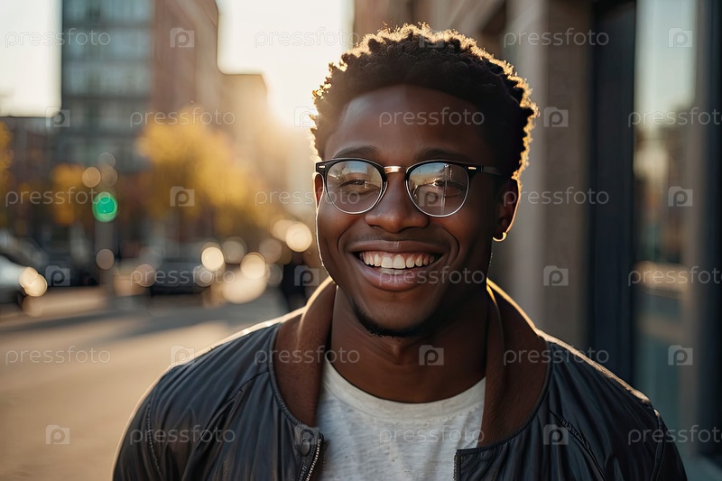 Модный молодой чернокожий мужчина в очках, городской вечерний свет, испытывающий усталость глаз от цифрового обучения и времени перед экраном, университетский образ жизни, стильная мода, зона свободного текста