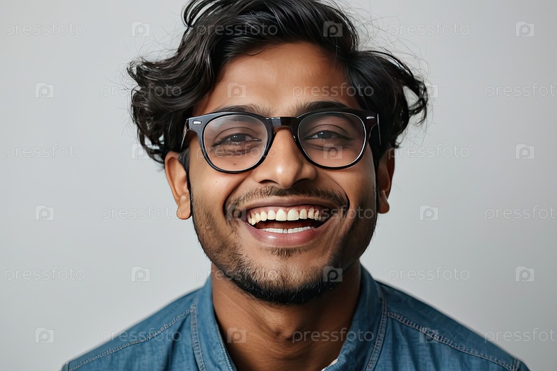 Счастливый молодой индийский мужчина в модных очках, фоном из студии, испытывающий усталость зрения от использования гаджетов, городской студенческий стиль, текстовое пространство для образовательной рекламы