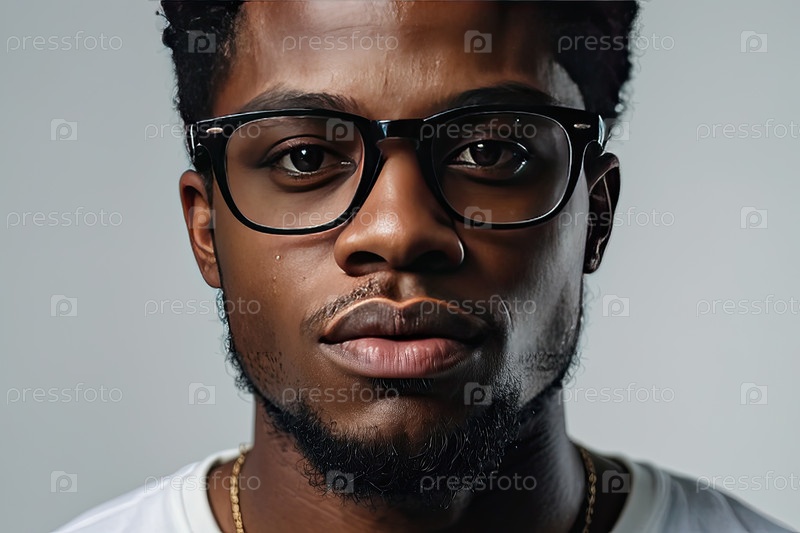 Молодой чернокожий мужчина, очки, студийное образование, борьба с утомлением глаз из-за работы на компьютере, студенческое оздоровление, здоровый городской образ жизни, место для текста на баннере