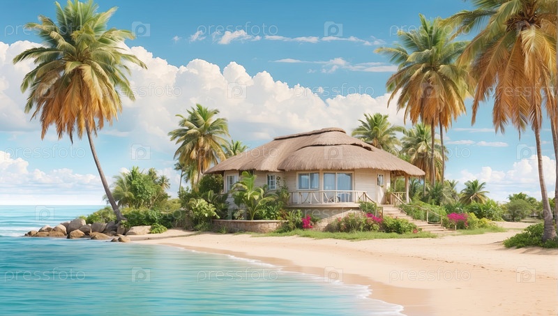 Пляжная вилла на белом песке, частный отдых со всем включенным, семейный рай для досуга, цифровая иллюстрация мультфильмов для туристического агентства