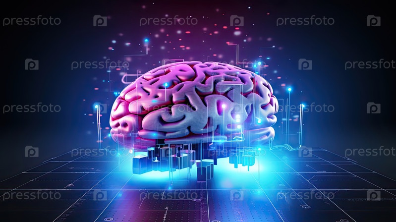 Розовый светящийся мозг с цифровой сеткой на черном, ИИ будущая технология, умная аналитика, нейронаука, когнитивное развитие, инновационная медицинская инженерия