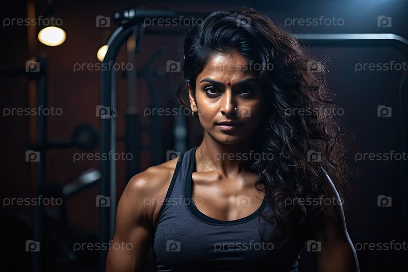 Индийская женская фитнес-тренера в тренажерном зале, спортсменка, спортивная одежда, мотивация, здоровый персонал, профессиональный тренер, оздоровительный клуб, личное обучение, область для брендинга
