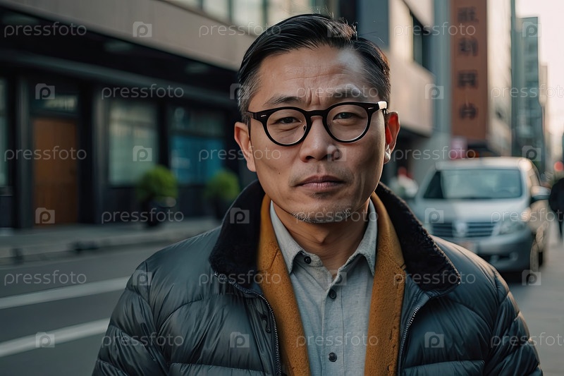 Пожилой азиат в очках, серая куртка, стоящий на городской тротуаре, спокойное выражение лица