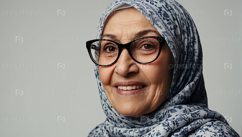 Зрелая арабская женщина в узорчатом хиджабе и очках, улыбающаяся на камеру с пространством для текста, очков, коррекции зрения, здравоохранения, профессионального женского портрета