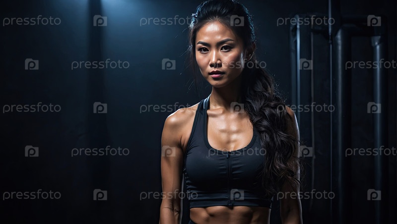 Азиатская женщина тренер фитнес-клуба, спортсменка, тренировка в тренажерном зале, ношение спортивной одежды, здоровье, активный образ жизни, мотивационный портрет, персонал, текстовая область