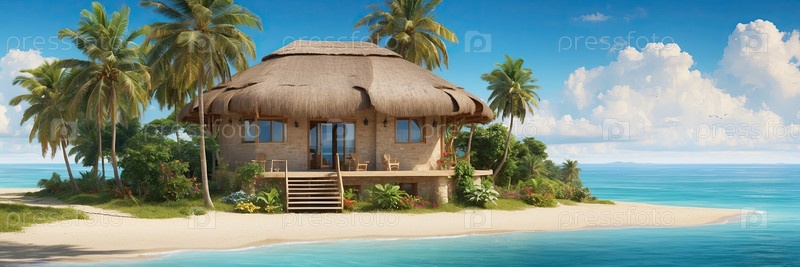 Соломенный бунгало с видом на пальмы, частное семейное жилье со всем комплексом, морской курорт, цифровая иллюстрация мультфильмов, рай отдыха