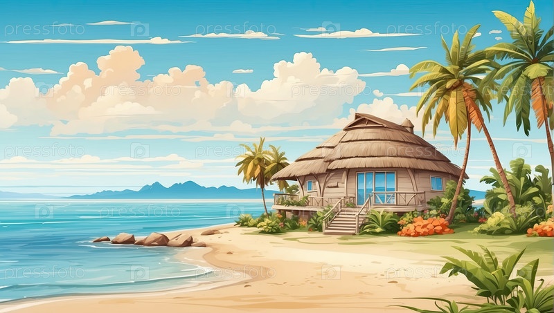 Дом на пляже с соломенной крышей и видом на море, частный райский отдых, летняя аренда "все включено", цифровая иллюстрация, творческое курортное искусство