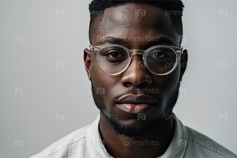 Серьезный чернокожий мужчина в очках, серая студия, академическое образование, проблемы со зрением после цифровых экзаменов, поощрение, оздоровление, студенческая жизнь, баннер для текста
