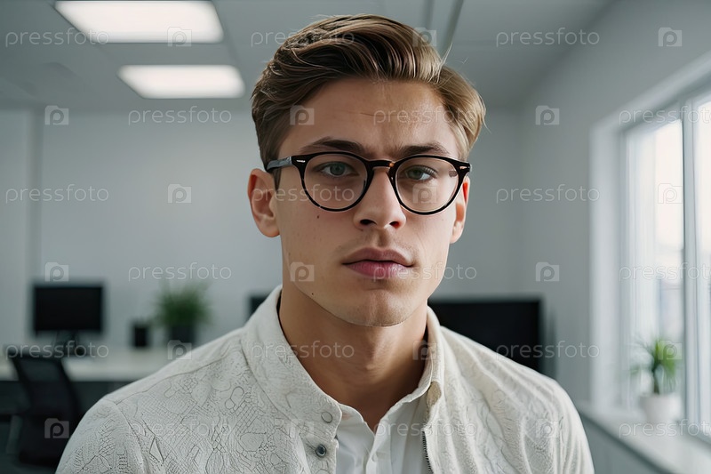 Молодой человек в очках сидит за офисным столом, современное рабочее пространство, коррекция зрения, очки, цифровая фокусировка, деловое отношение, профессиональное консультирование, место для текста