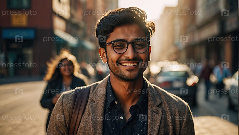 Уверенный молодой южноазиатский мужчина в очках, профессиональная городская улица, студенческий и офисный внешний вид, сталкивающийся с снижением зрения от цифровых экранов, современное здравоохранение, текстовое пространство
