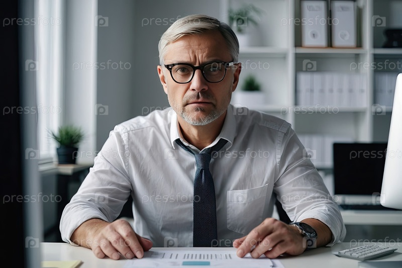 Зрелый офисный менеджер в очках за современным столом, растение на заднем плане, цифровое рабочее пространство, ясность видения, производительность бизнеса, уверенность, здоровье, консультирование, копирасположение