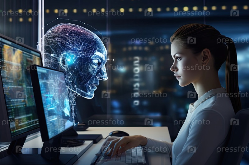 Женщина-инженер и мозговой интерфейс ИИ разрабатывают технологии следующего поколения в современном рабочем пространстве, творческом сотрудничестве и цифровых инновациях для будущих проектов