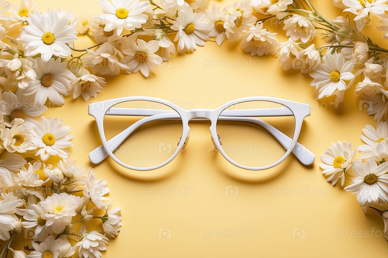 Белые очки с ромашками на желтом фоне, концепция весенней оптической моды, бутиковые очки, яркая розничная реклама, цветочный стиль и текстовое пространство