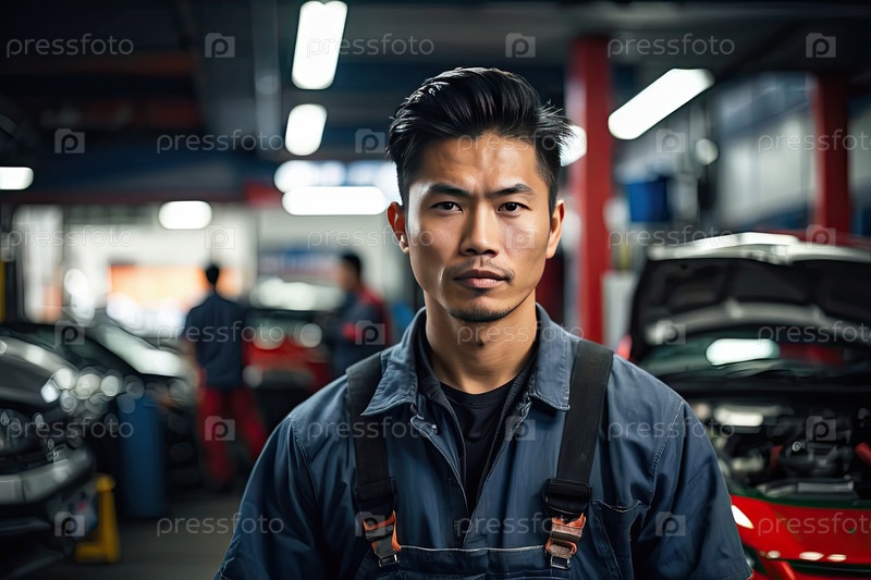 Молодой азиатский механик-автомобильщик в синей и серой форме на автомобильной мастерской, технический работник, профессиональная команда, современный автосервис, копировальное помещение