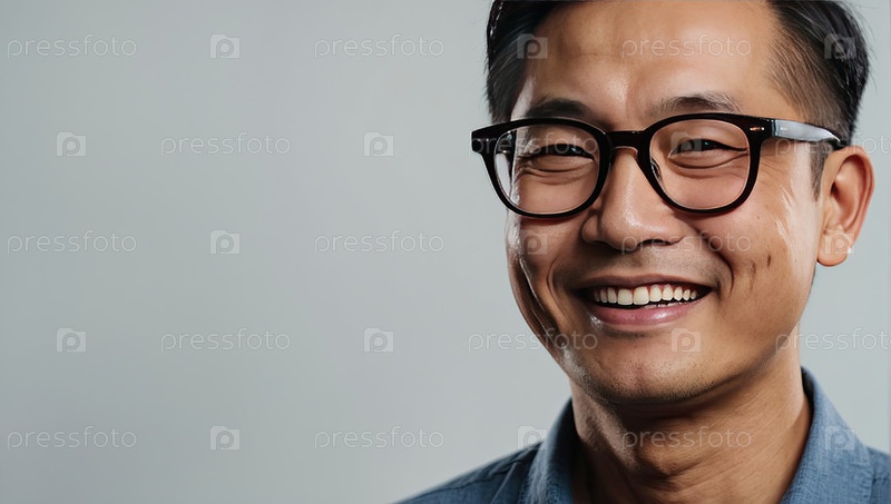 Азиатский мужчина с закругленными очками, полосатой рубашкой, полуулыбка в студии, серый фон. проблема взрослого зрения, выбор очков, умное отношение, расслабленное настроение, копирайтинг