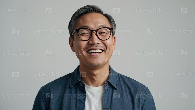 Старший азиатский мужчина в очках, короткие седые волосы, флотская рубашка, слегка улыбающийся, студия, белый фон