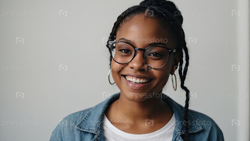 Девушка-подросток афроамериканского происхождения с простыми очками, чехлом, открытой улыбкой, нейтральным фоном. проблемы со зрением молодежи, стильная мода, учебные материалы, цифровые приложения, промопакет