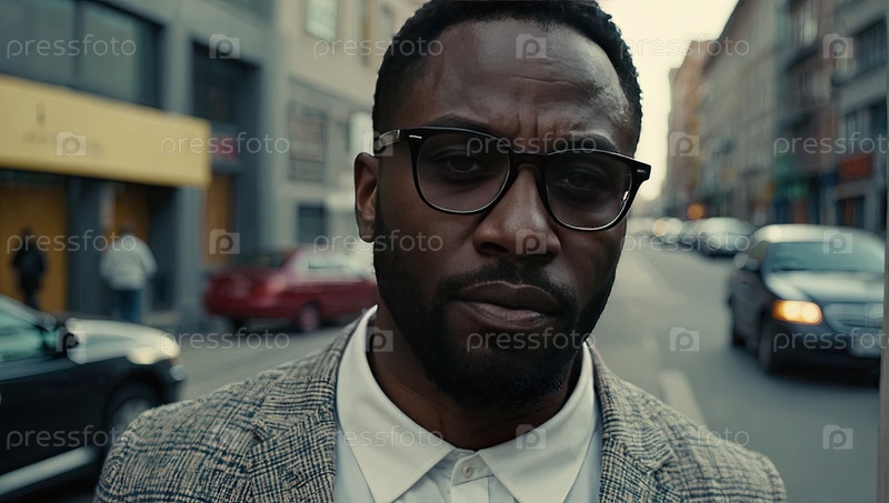Молодой афроамериканский мужчина с очками, бородой, серым костюмом, въезд в город на открытом воздухе, постоянные эмоции. проблемы со зрением взрослых, выбор оптимальных рамок, здоровый образ жизни, современная сцена, копирасположение