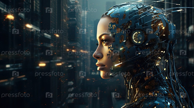 Женский андроид с футуристическим городским фоном, киберпанк-стиль, умные инновации, правый край копирования пространства для брендинга, текста или веб-контента
