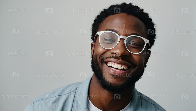Улыбающийся молодой чернокожий мужчина в очках, портрет студии, усталость цифрового зрения, студенческий оптимизм, городской современный внешний вид, здоровая мода, рекламное текстовое пространство