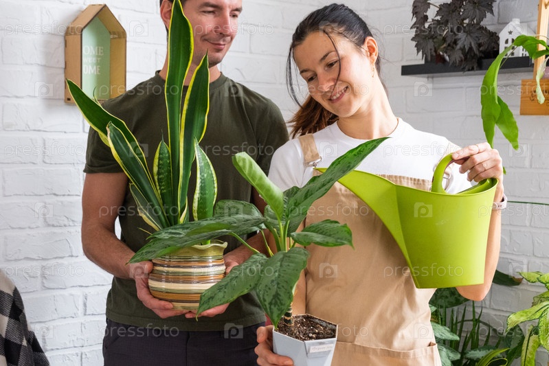 Молодая пара поливает горшковую сансевирию дома, в окружении тропических комнатных растений, современный эко-интерьер, игривое общее хобби, радость отношений