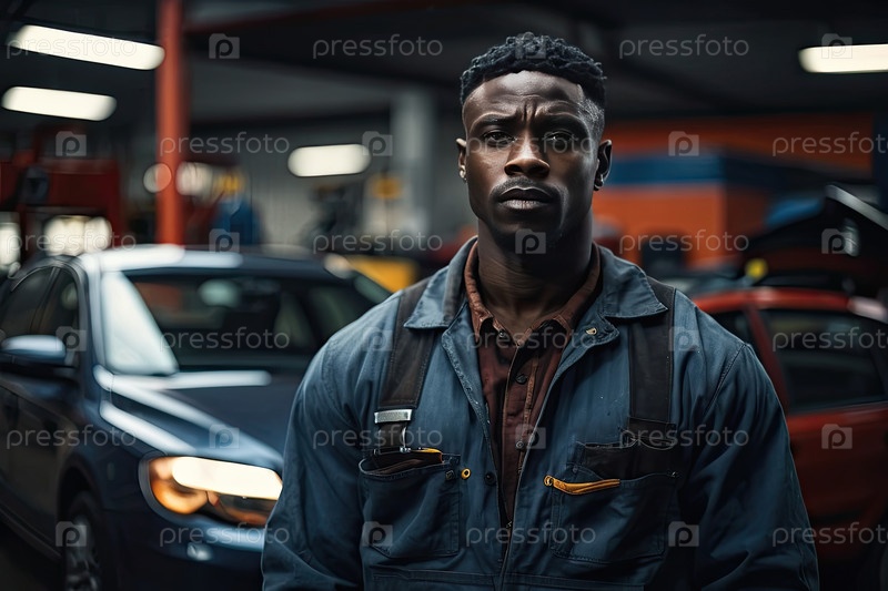 Уверенный серьезный афроамериканский механик-автомобильщик с бородой в серой и синей форме на автомастерской, профессиональный персонал, технические навыки, текстовая зона