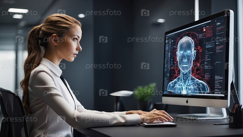 ИТ-специалист общается с искусственным интеллектом на мониторе во время проекта нейронной сети в офисе Bright, командной работы и интеграции искусственного интеллекта