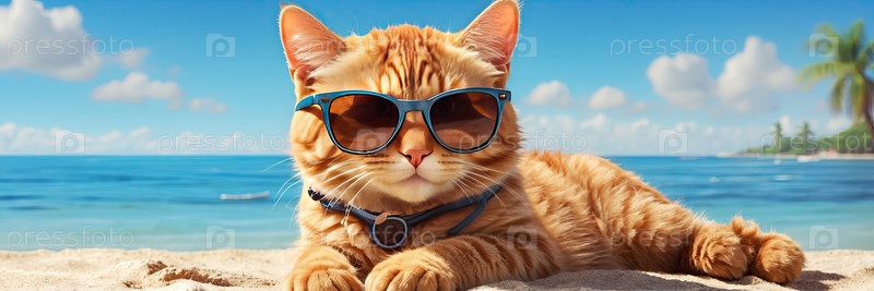 Кошка загорает на песке, безопасность путешествий для животных, политика воздушного транспорта, проживание в отеле с домашними животными, риск жары, отпуск приют для питомцев, социальные поездки и объявления