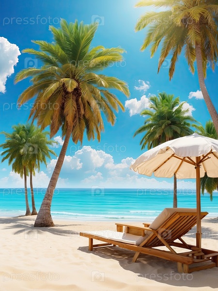 Бирюзово-чистая вода, пляжные кровати и зонтики, тема роскоши и оздоровления, комфортные туры, много свободного пространства над небом для текстового наложения