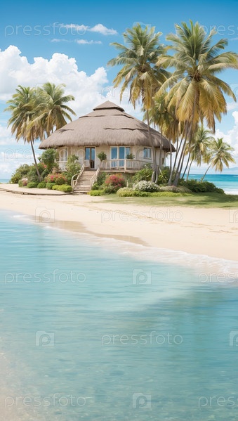 Современный бунгало на берегу воды, эксклюзивный курорт "Все включено", тихое семейное жилье, спокойная иллюстрация цифрового мультфильма