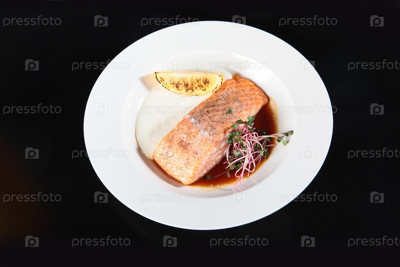 Филе жареного лосося с лимонным куском. Кусок лосося на белой тарелке, украшенный микрозелеными растениями и специями. Слиток запеченного лимона. Вкусное блюдо из морепродуктов. Здоровая еда