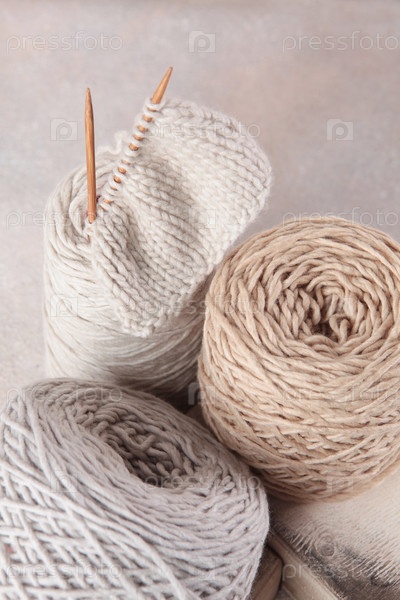 Нить для вязания на трикотажных иглах. хлопковая нитка серого и бежевого цвета. трикотажные иглы из бамбука. концепция резьбы