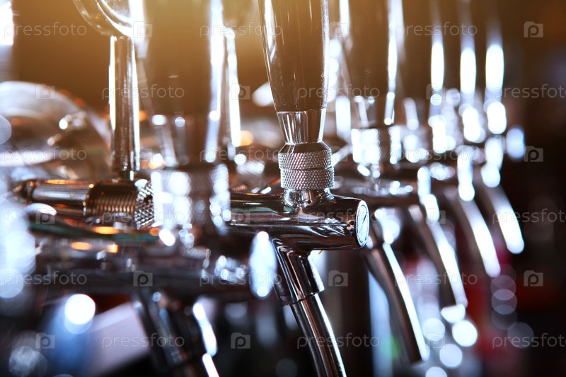 Пивные краны в пабе. Винтажный стиль. Крафт-пиво. Барной стол. Блестящие стальные журавли. Никто. Выборочный фокус. Концепция алкоголя