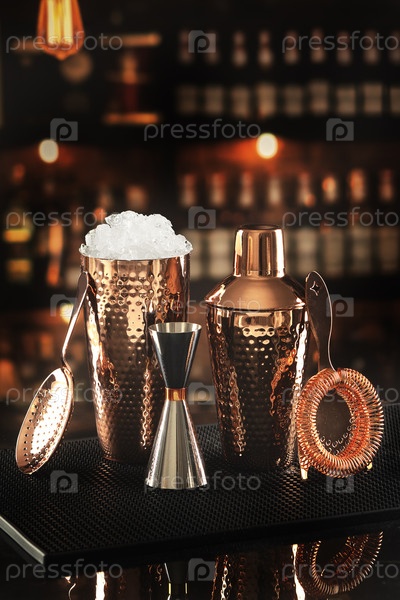Набор аксессуаров для бармена. Шейкер и стакан для смешивания коктейлей из меди. Набор для приготовления коктейлей медного цвета. Лед в стакане для смешивания коктейлей
