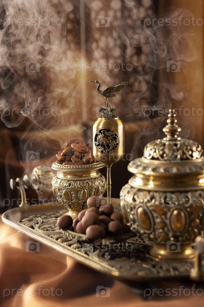 Праздник Рамадан.Сжигатель для фимиам.Праздничная поздравительная открытка, приглашение на мусульманский священный месяц Рамазан Карим.Темный фон
