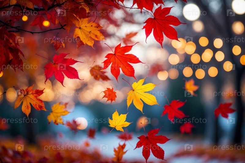 Генеративный искусственный интеллект Фон осенней атмосферы с желтыми и красными листьями, падение листьев в лесном парке