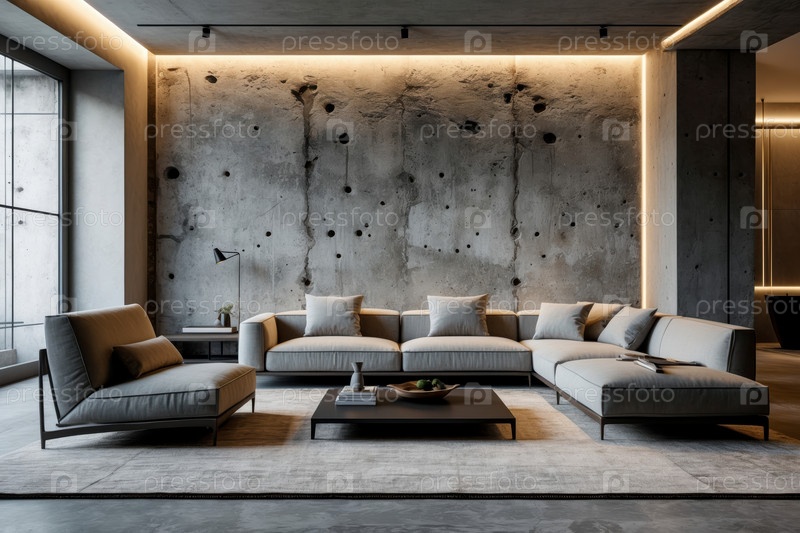 AI генеративный современный уютный интерьер гостиной бетонная серая стеновая мебель комфортабельный дизайн дома
