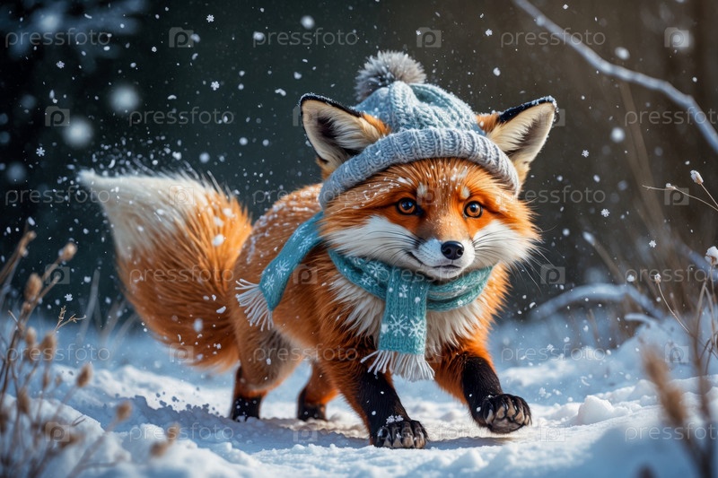 ИИ генеративный портрет лисы в вязанной зимней одежде шляпе и шарфе, животное во снежном снегу зимой