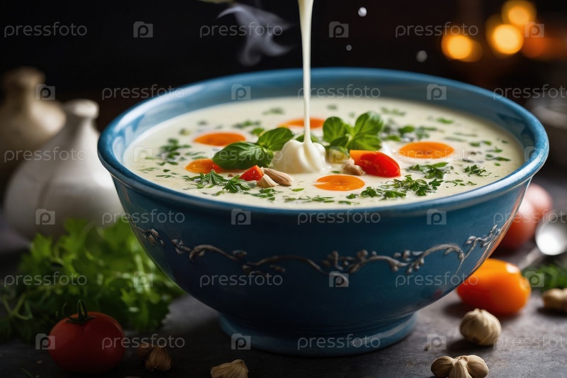 Традиционный белый йогуртовый сливочный суп в миске ужин обед, овощи вегетарианская кухня AI Generative