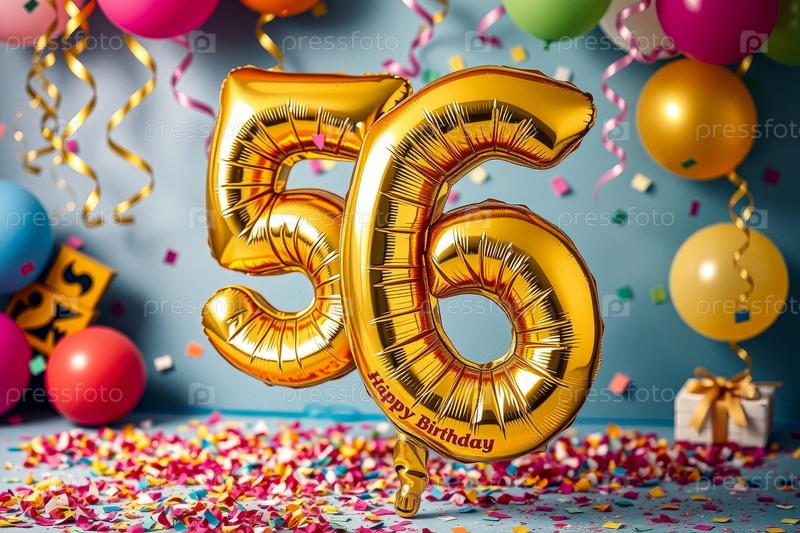 Гелий день рождения воздушный шар формы номер пятьдесят шесть, золотые буквы фигура 56 праздник праздничный фон декор