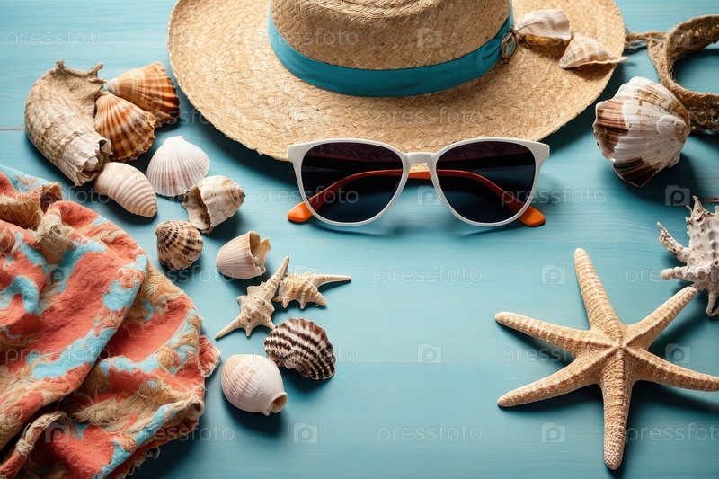 Натуральная летняя тропическая квартира лежала с атрибутами выходных на морском океане AI Generative