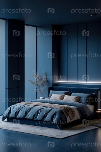 Уютный интерьер Спальня Квартирная комната Голубой цвет, Комфортный дом Дизайн современного дома AI Generative