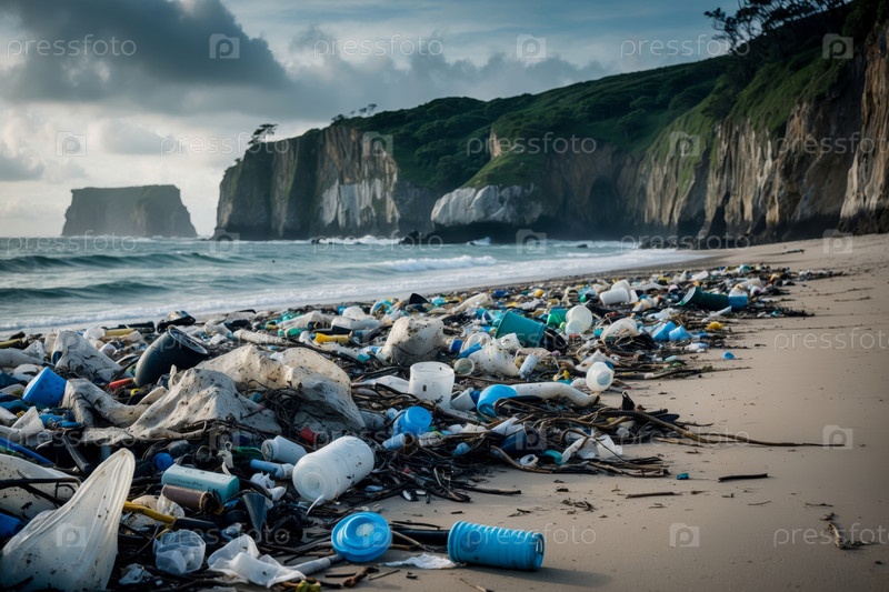 ИИ генеративное загрязнение окружающей среды морского океана побережье, мусорный полигон свалка на пляжном водоеме