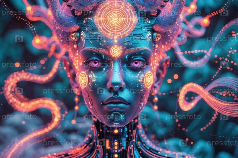 AI Generative Женщина-гуманоид в футуристическом неоновом костюме, человек на будущем научном фантастическом завтрашнем фоне