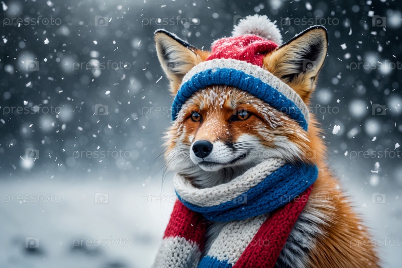 AI генеративный портрет лисы в вязанной зимней одежде шляпа и шарф, животное во снежном снегу зимой