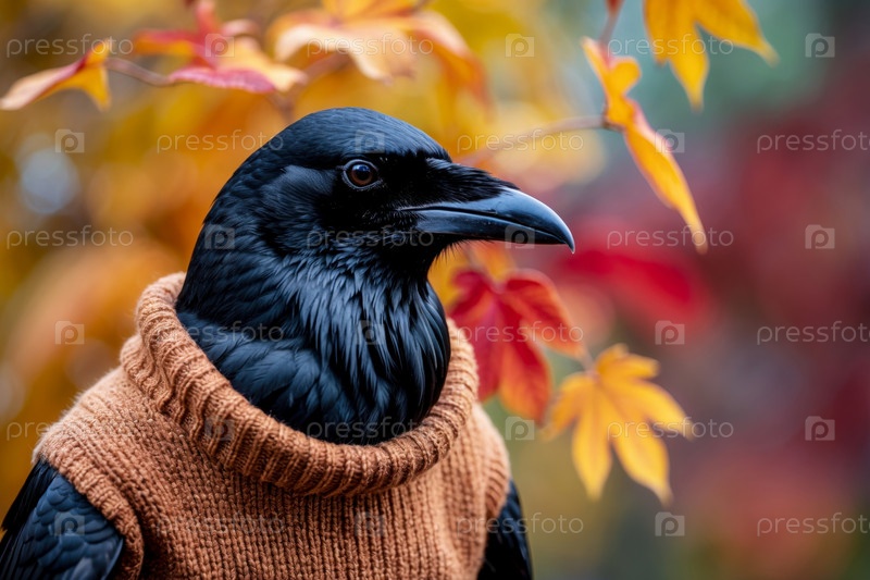 Ворона в трикотажном свитере осенний лесный фон, животное в красно-желтой листьях AI Generative