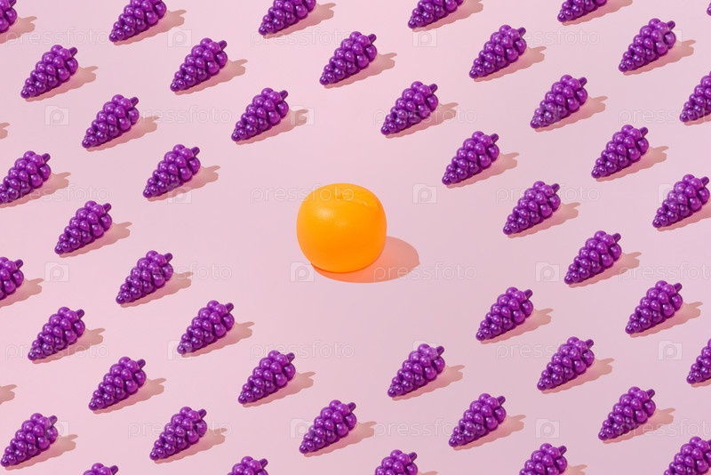 Творческий абстрактный летний виноград и оранжевый рисунок плоского уклада на пастельно-розовом фоне минимализма