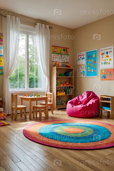 AI Generative Современный дизайн уютного интерьера детской комнаты красочный, декоративная игровая комната в доме