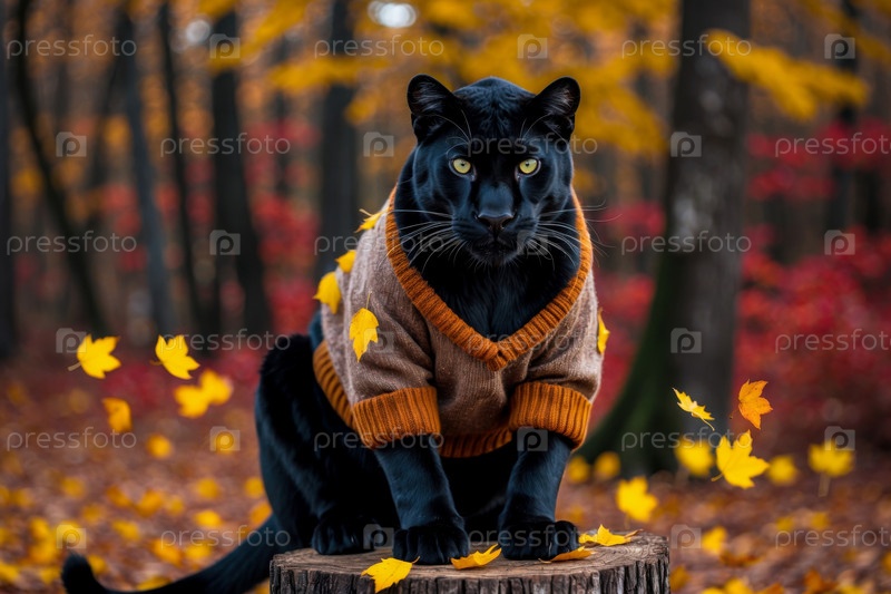 AI Generative Panther в трикотажном свитере на осеннем лесном фоне, животное в красно-желтых листьях