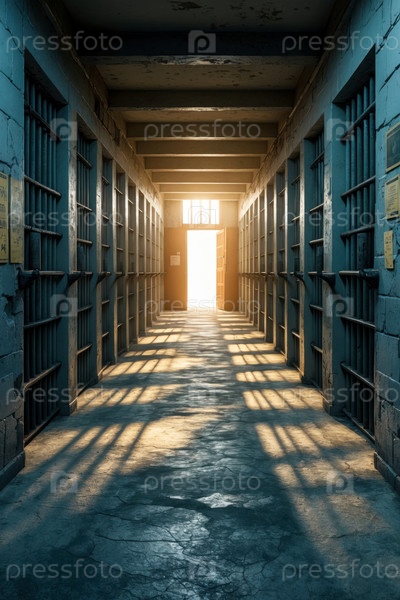 Интерьер тюремного здания внутри, коридор с изоляцией тюремной камеры стальных дверей AI Generative